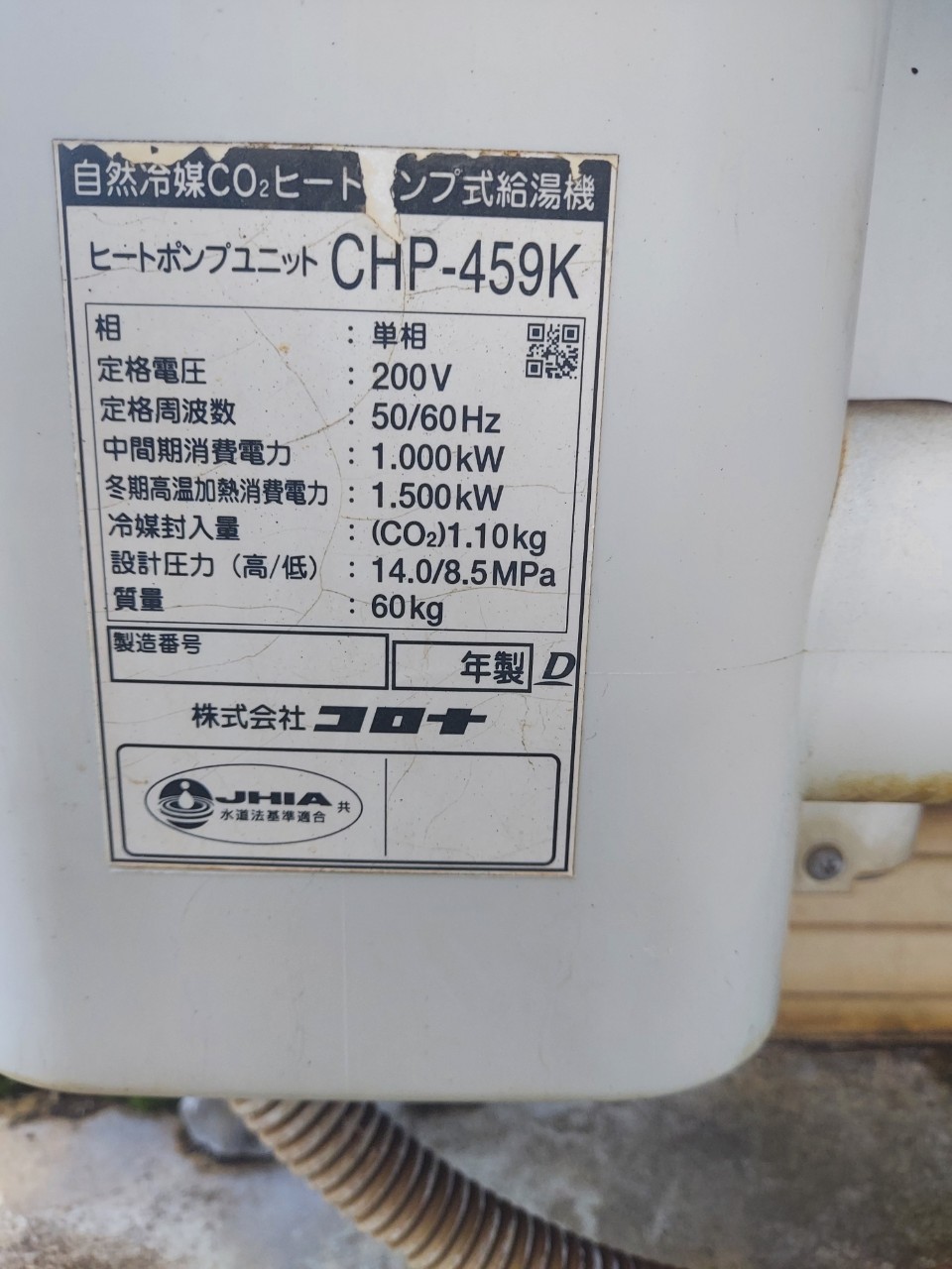 安曇野市 コロナエコキュートCHP-459K→コロナ自然冷媒CO2家庭用ヒートポンプ給湯機ヒートポンプユニットCHP-Y454K エコキュート交換工事