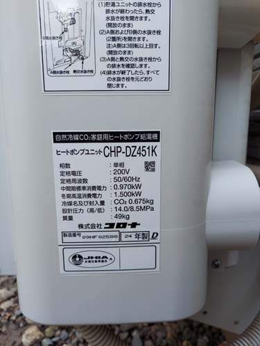 桶川市 コロナ自然冷媒CO2家庭用ヒートポンプ給湯機 ヒートポンプユニットCHP-DZ451K エコキュート交換工事