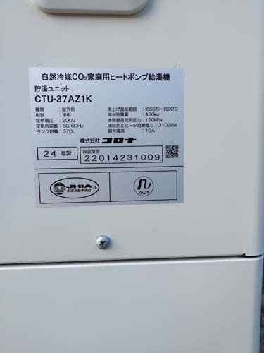 茅野市 三菱電機エコキュート→コロナ自然冷媒CO2家庭用ヒートポンプ給湯機貯湯ユニットCTU-37AZ1K、ヒートポンプユニットCHP-DZ451K エコキュート交換工事